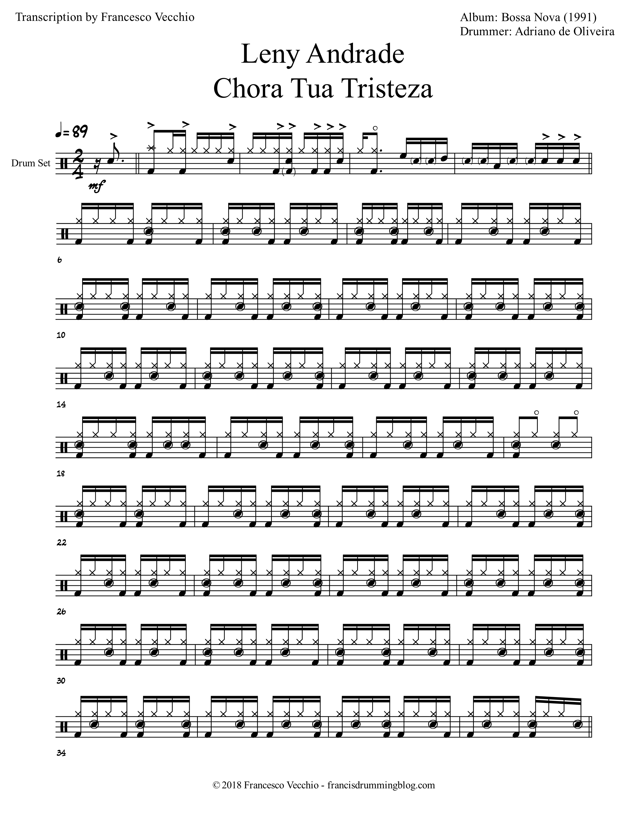 Here’s the complete drum transcription of his work on the Brazilian tune “Chora Tua Tristeza” by Leny Andrade, from the album Bossa Nova (1991). The song is written and performed in the samba style, with a half-time feel on the bridge. Adriano plays the hi-hat in continuous 16th-note without accents with the tip of the stick, except where indicated in the transcription.
