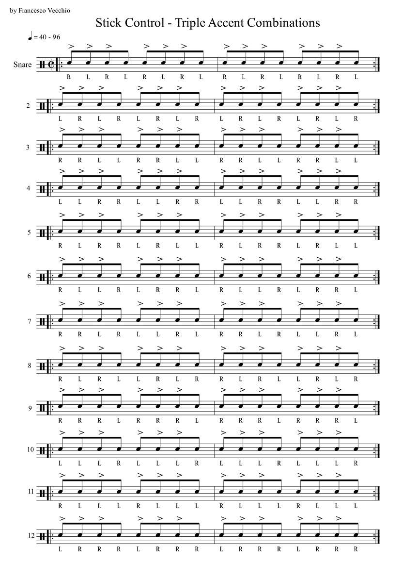 In this last part of the series Stick Control Accent Workout, I introduce the three accent combinations as shown in the preview image below.