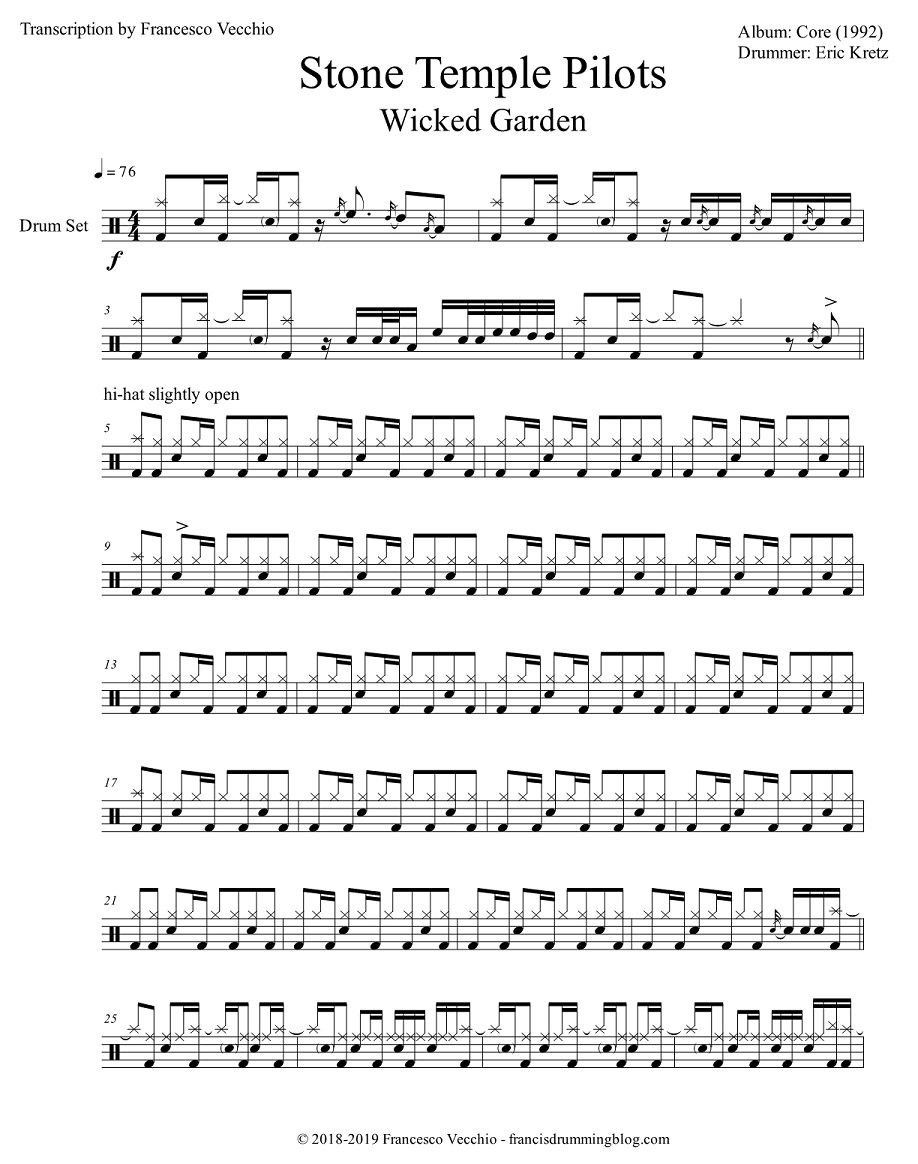 Stone Temple Pilots – Wicked Garden (Drum Sheet Music) Posted on 3 February 20197 June 2024 by Francesco Vecchio Here’s the full drum sheet music for “Wicked Garden” by the rock band Stone Temple Pilots, from the album Core (1992). The drum transcription is available for purchase. BUY NOW Condividi: Click to share on X (Opens in new window) X Click to share on Facebook (Opens in new window) Facebook Like Loading... Correlati