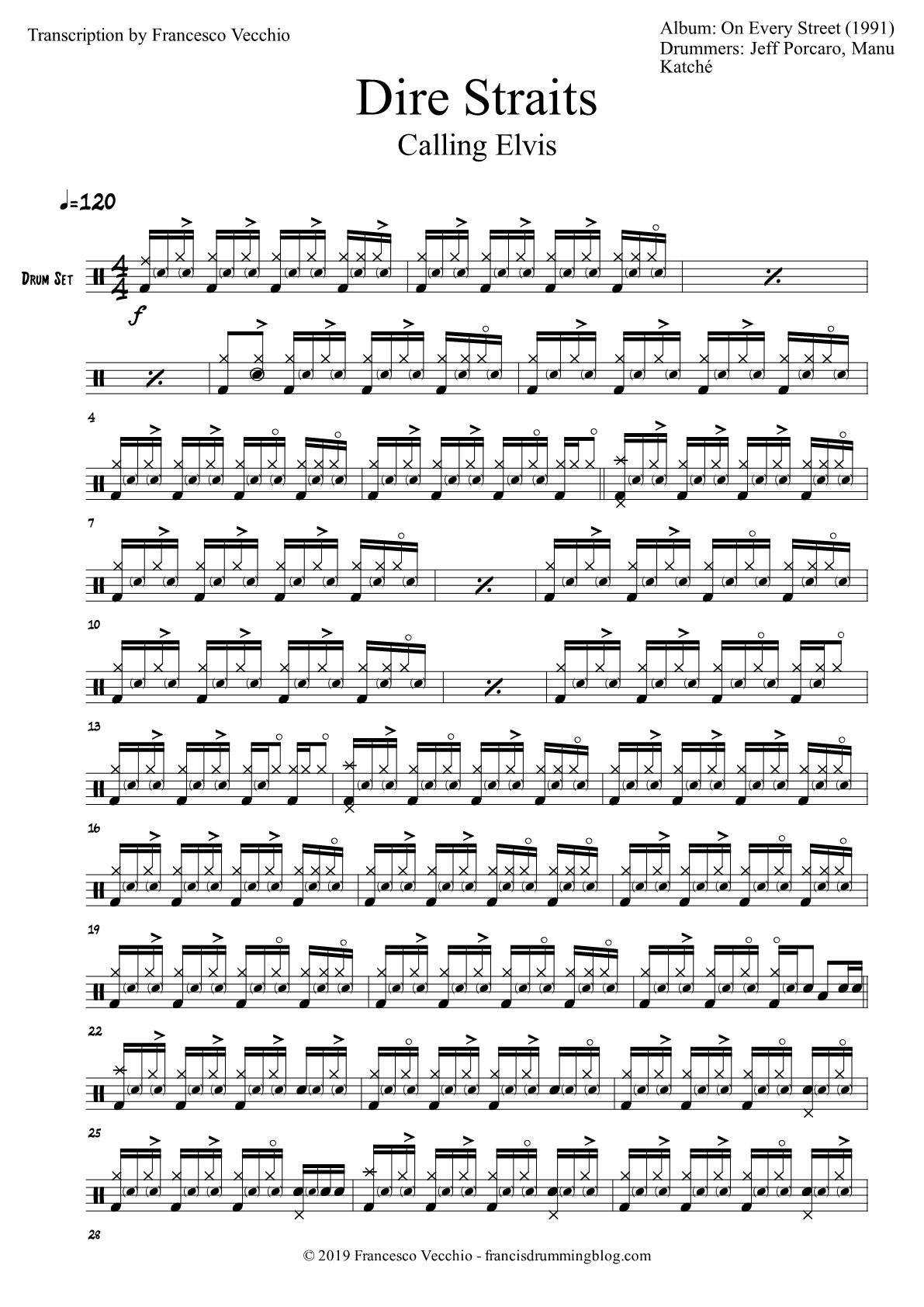 Here’s the full drum sheet music (8 pages) for “Calling Elvis” by Dire Straits, from the album On Every Street (1991) with Jeff Porcaro and Manu Katché on drums. The transcription is available for purchase.