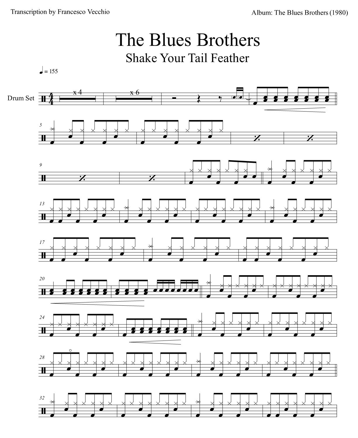 The Blues Brothers – Shake Your Tail Feather (Drum Sheet Music) Posted on 17 December 201929 March 2024 by Francesco Vecchio Here’s the full drum transcription (3 pages) for “Shake Your Tail Feather” by The Blues Brothers, included in the film The Blues Brothers (1980) by John Landis. The drum transcription is available for purchase. BUY NOW Condividi: Click to share on X (Opens in new window) X Click to share on Facebook (Opens in new window) Facebook Like Loading... Correlati