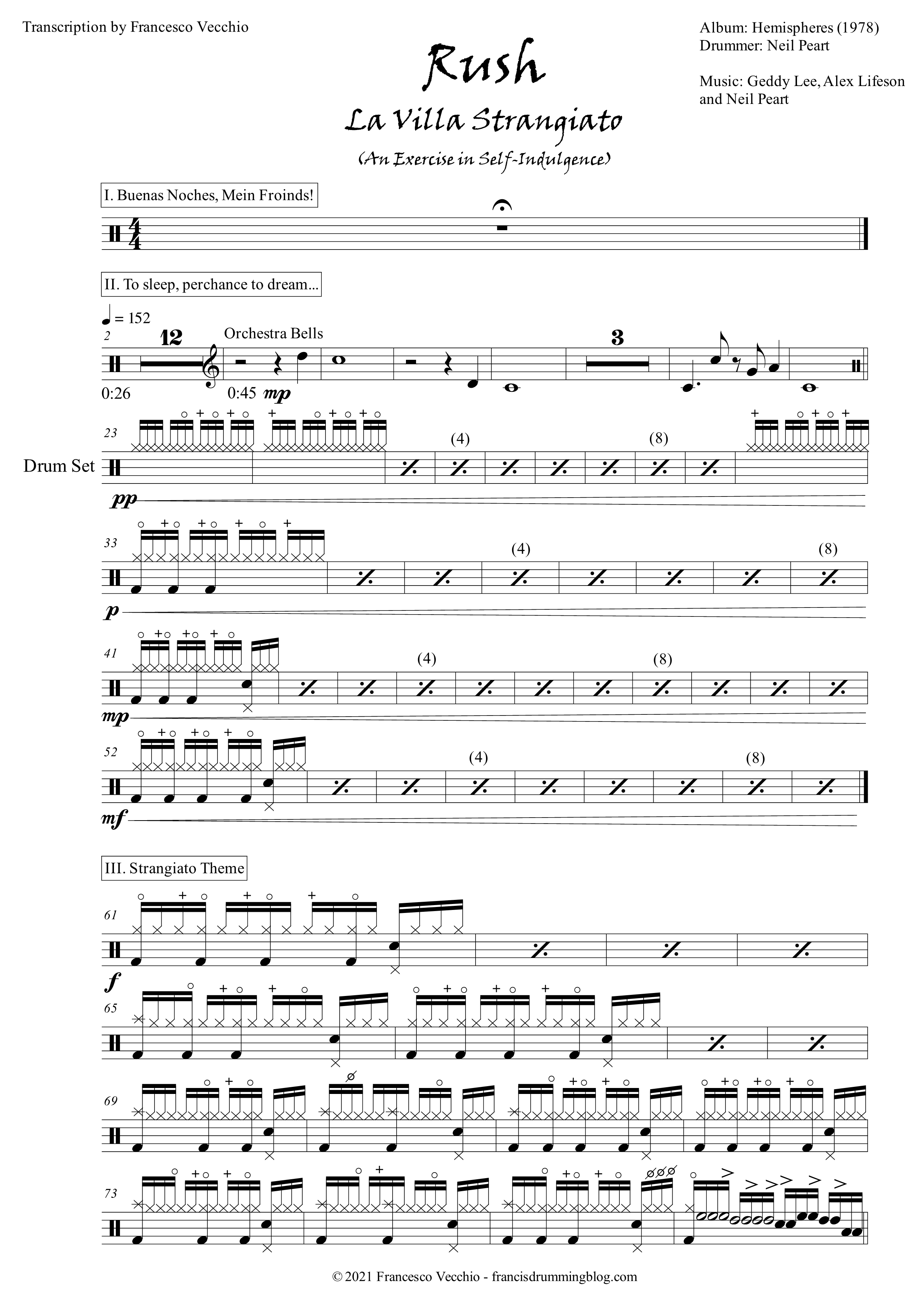 Here’s the full drum sheet music for “La Villa Strangiato” by Rush, from the legendary album Hemispheres (1978) with Neil Peart on drums.