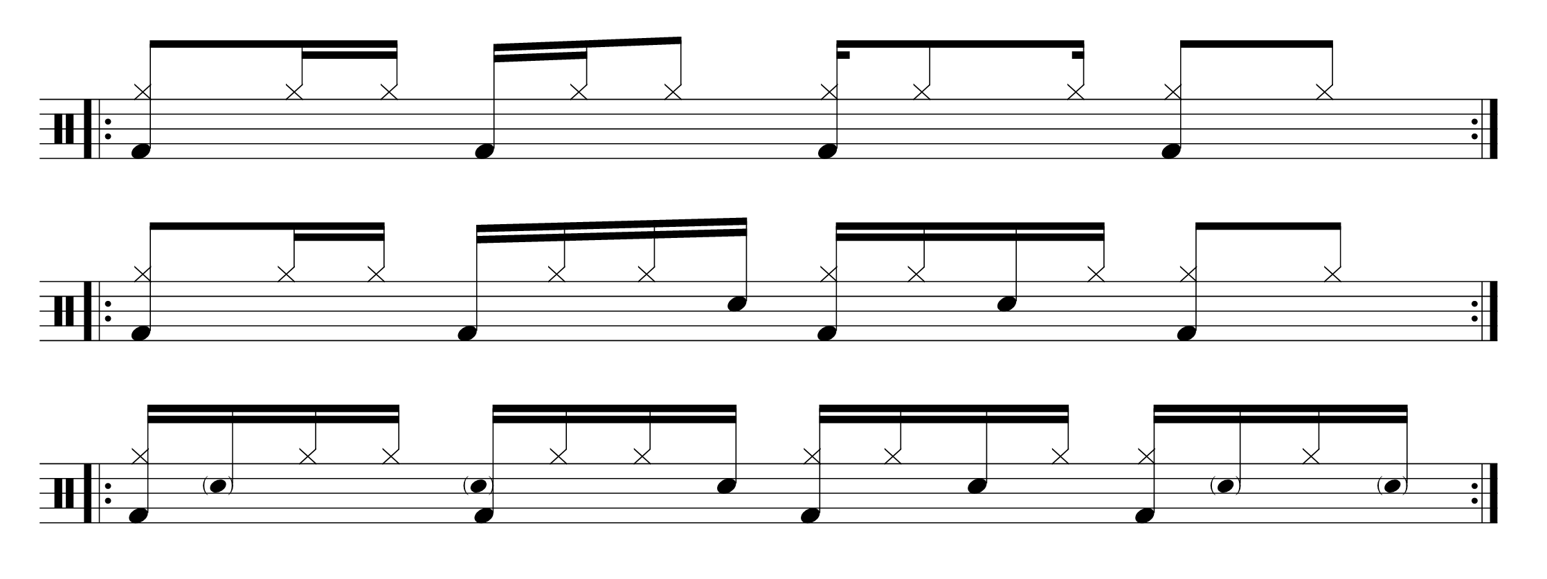 The variations are endless, try to play the pattern on the ride cymbal (on the cowbell, or on any rims). Here are some foot patterns to elevate your groove.