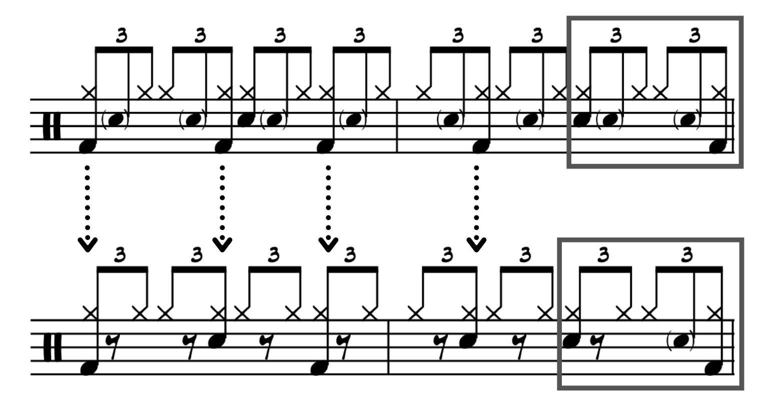 The outro drum groove is similar and related to the main one, without ghost notes and with the first backbeat anticipated. The bass drum/snare pattern is based essentially on the 3 over 4 hemiola figure of the main groove. As you can see in the image below comparing the two grooves, the second and fourth bass drum hits are substituted with the snare. The last two beats are similar; the ghost note on the third beat is omitted.
