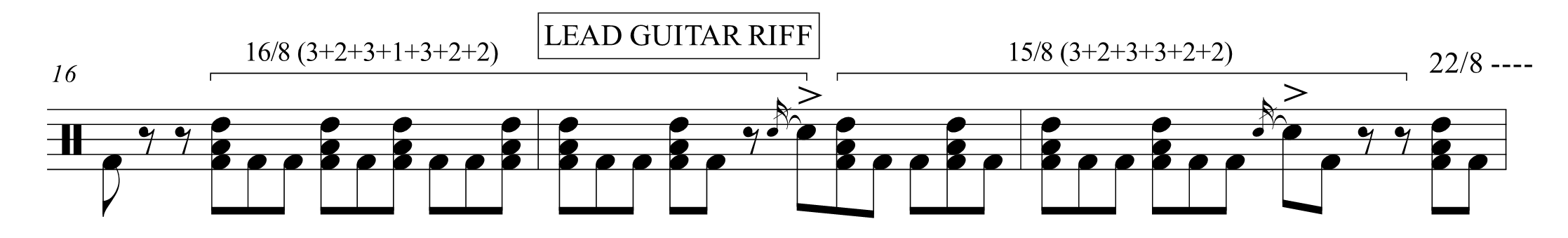 From bar 17 with the lead guitar riff that comes in, Haake plays the snare drum on the third beat. A polymetric pattern variation is played between bars 16 and 17, a 16/8 pattern subdivided as 3+2+3+1+3+2+2 is followed by the 15/8 seen before. The main 22/8 pattern is repeated over the bar line, a cycle completed every eleven bars.