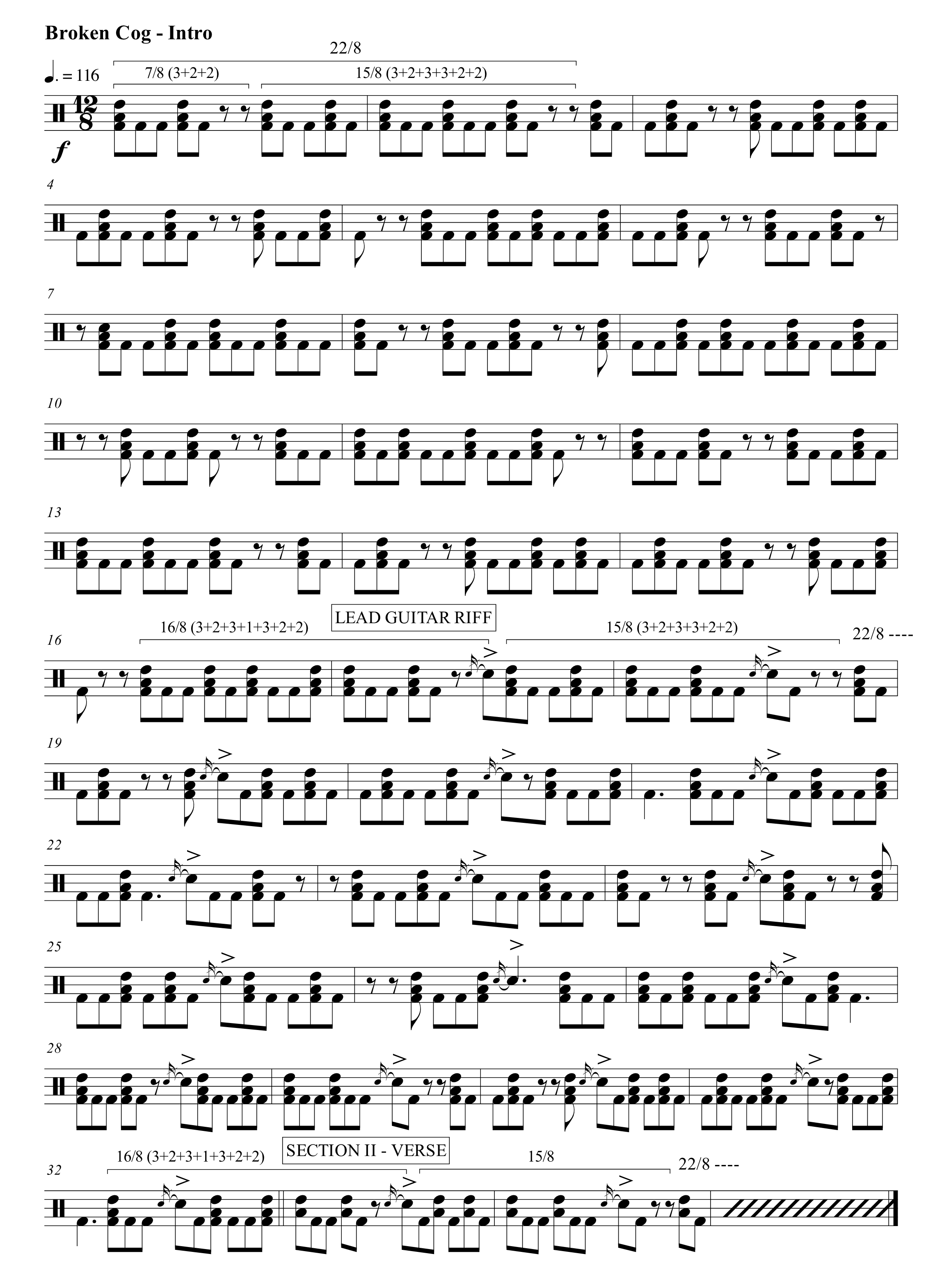 “Broken Cog” is the opener track, a medium-slow 12/8 with a tempo of 116 bpm. The main pattern is 22 eighth notes long, played on the bass drum in unison with the powerful guitars and bass in staccato. As notated, the pattern is played with a single bass drum pedal.
