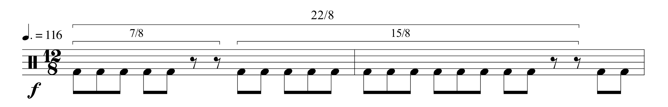 Here’s the complete pattern with the two toms played in unison. The main 22/8 pattern can be subdivided into two rhythmic lines: a 7/8 subdivided as 3+2+2 and a 15/8 subdivided as 3+2+3+3+2+2. This is a signature of Haake’s drumming.