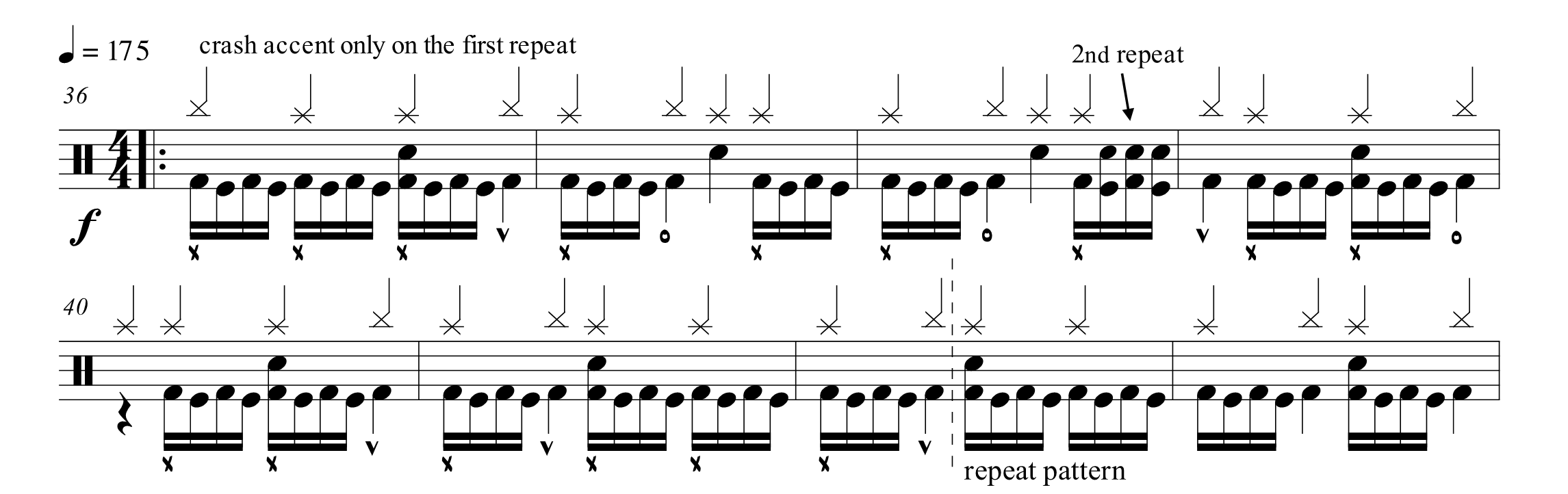 “The Abysmal Eye” is the perfect single every Meshuggah fan was waiting for. Like other songs of the band, the structure is in 4/4 with a fast tempo of 175. In the same way as “Broken Cog” the snare drum is played on the third beat. The pattern is 26 beats long and repeated for the entire duration of the intro. As notated in the image below, the symbols help to understand the pattern; so there are three rhythmic cells: the four bass drum 16th notes notated with the x, the crash accent in unison with the bass drum notated with the v, and its open/long variation notated with the o.