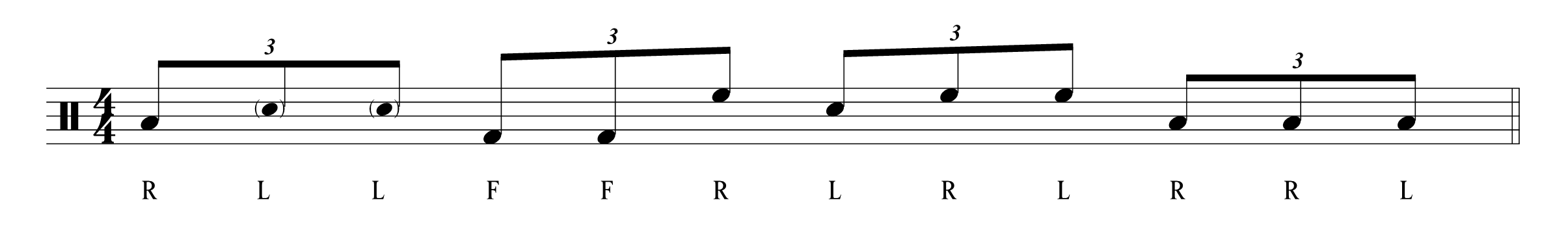 The idea is based on 8th-note triplets with sticking that mixes singles and diddles. The snare on the third beat gives the fill a half-time sensation. From a construction point, the first two beats are inspired by a Steve Gadd lick, with a difference for the last 8th note of the second beat played with the right hand, which “inverts” the sticking for the last two beats. The idea for the second part of the fill is straightforward, moving from the snare to the tom and floor tom, adding a diddle on the last beat.