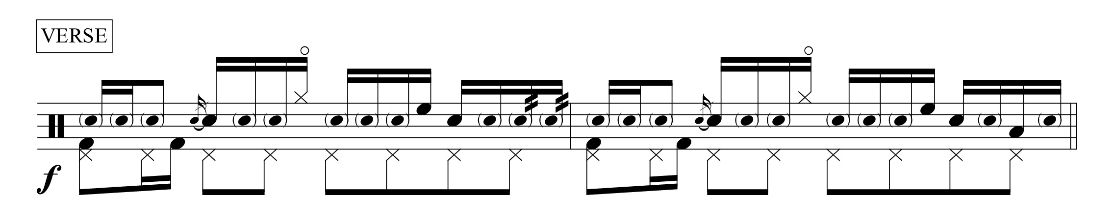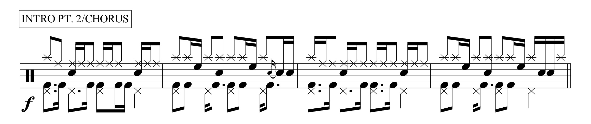 The second part of the intro introduces a powerful section with distorted guitars and a heavy groove. It consists essentially of two distinct bars following the guitar riff. The same drum part is repeated in the chorus with some bass drum variations.