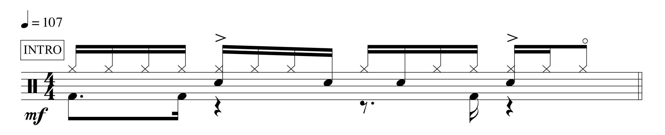 Listening to “And I” we hear five distinct drum beats for every section: intro, verse, chorus, interlude, and final chorus/outro. Travis Barker’s ability to smoothly move from one section to another is remarkable, keeping a solid beat with great energy and stamina. The song opens with the drums, featuring a one-bar hip-hop/R&B drum beat repeated for the entire section at 107 bpm. As notated below, the snare drum hits between the backbeat (which are not ghost notes, as you can hear) are alternated with the hi-hat.