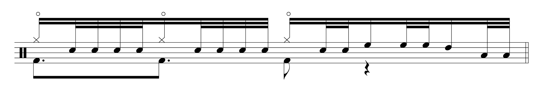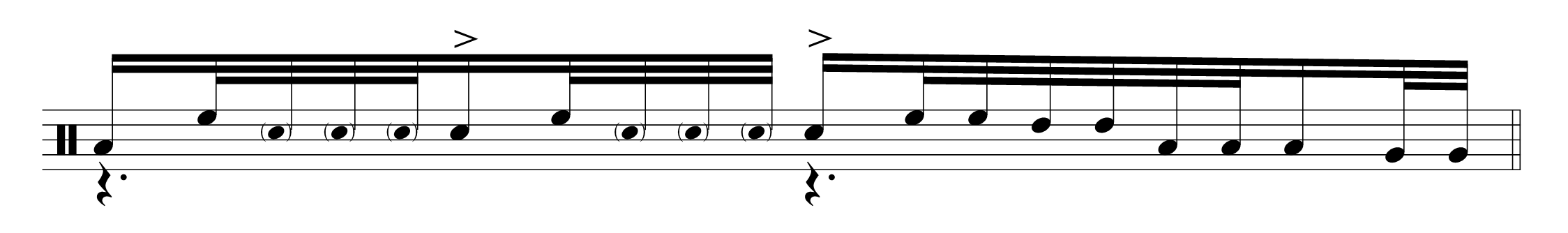- The second consists of a single idea, one 16th-note and two 32nd-note, repeated three times from the snare to the rack toms and floor tom.