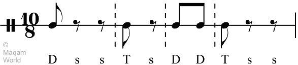The Samai Thaqil is a classical 10/8 rhythm of Ottoman-Turkish origin, very popular among belly dancers for slow sections. The Arabic variation of this rhythm is also known as “Sama’i Thaqil.” You can hear Samai in Muwashah music (or muwashshah) for the musical accompaniment of poetic texts, in the megeance (the first song of the belly dancer’s show), classical Middle Eastern music, and drum solos. The name “Samai Thaqil,” translating to “heavy Samai,” underscores its elaborate and weighty feel, distinguishing it from other rhythmic patterns. This rhythm has transcended centuries, rooted deeply in the Ottoman classical music tradition, maintaining its relevance and continuing to captivate audiences with its sophisticated interplay of beats and pauses. As a cornerstone of the Samai musical form, it provides a rhythmic foundation for expressive melodic and harmonic exploration, making it a favorite among composers and performers dedicated to preserving and innovating within the realm of Arabic music.