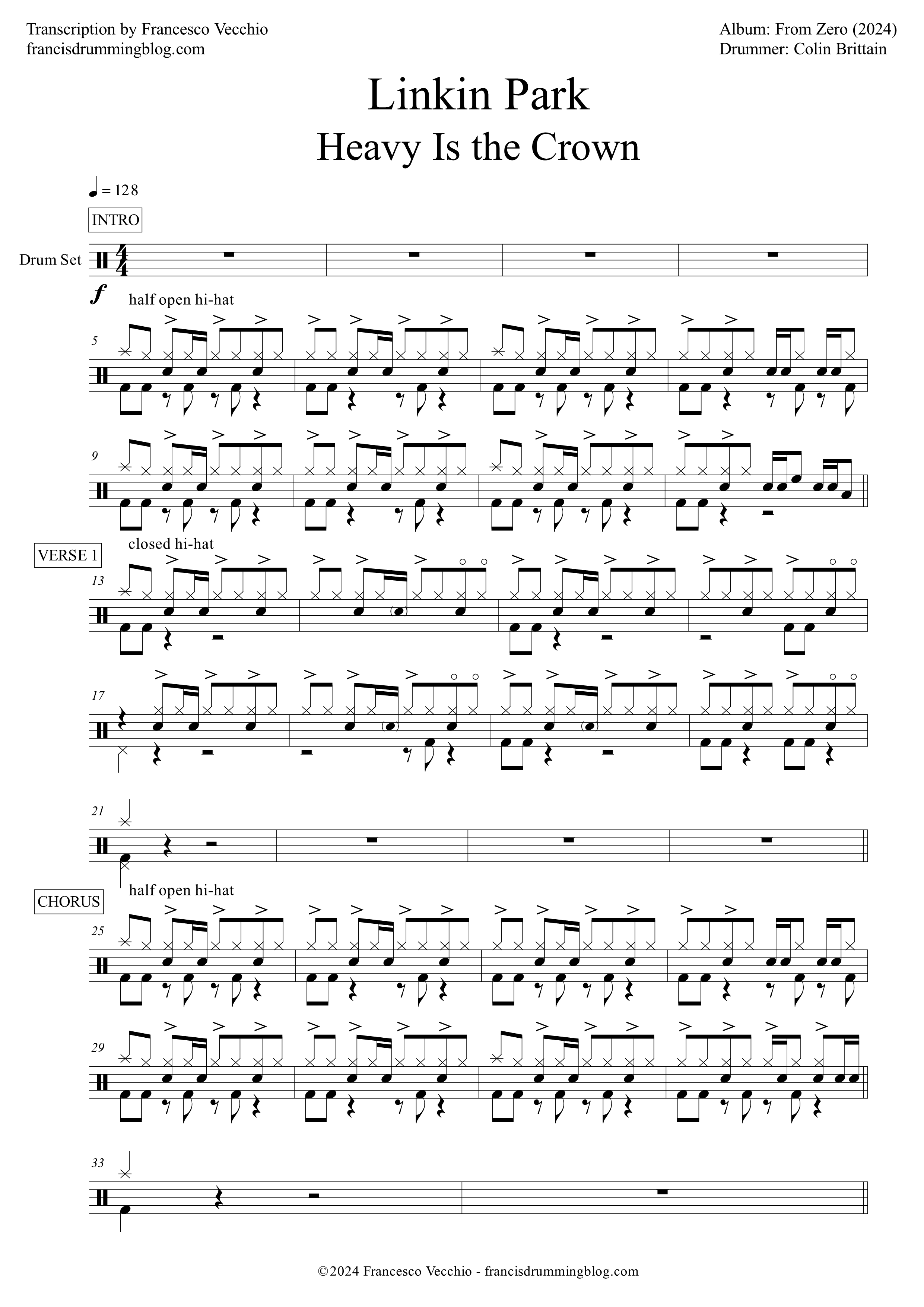 Another Linkin Park drum transcription is here! “Heavy Is the Crown” is the band’s second single released on September 24, which teases the upcoming album, From Zero, out on November 15. Stylistically, the song can be labeled as nu-metal, echoing the band’s legendary albums Hybrid Theory and Meteora. Verses are sung by Mike Shinoda in rap style, alternated by the explosive chorus provided by Emily Armstrong with a gritty and growl tone similar to Chester Bennington’s vocal style, particularly in the interlude section.