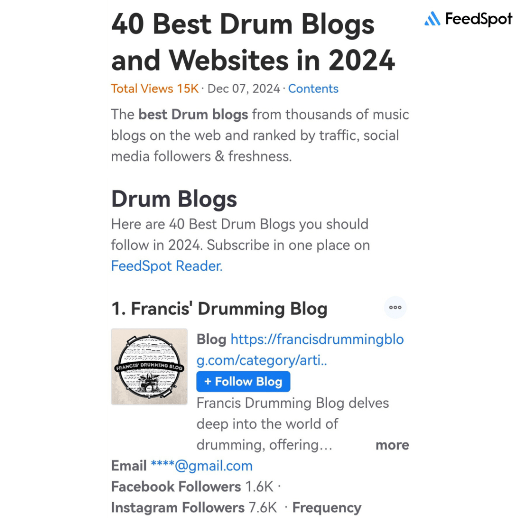 I’m thrilled to share that the blog has exceeded my expectations, with over 165,000 views and 57,000+ visitors, drawing organic traffic from all corners of the globe (special shoutout to visitors from the USA, UK, France, Italy, Australia, and Brazil). Social media engagement has seen remarkable growth; Instagram interactions have boomed! I’m also incredibly proud to have the blog ranked at the Top of the 40 drum blogs and websites based on traffic, social media reach, domain authority, and freshness. If you’re new here, don’t forget to follow Francis’ Drumming Blog on Facebook, Instagram, and Pinterest, where you can discover an extensive collection of original drum sheet music, transcriptions, exercises, and books. All my products are available through my Store, Amazon, Etsy, Scribd, and MyMusicSheet. You can access all my links here: linktr.ee/francisdrummingblog.