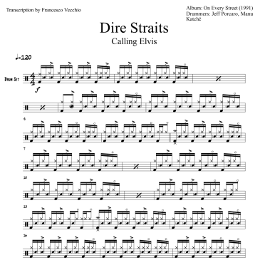 Here’s the full drum sheet music (8 pages) for “Calling Elvis” by Dire Straits, from the album On Every Street (1991) with Jeff Porcaro and Manu Katché on drums. The transcription is available for purchase.