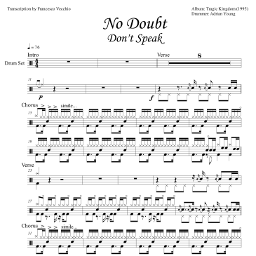 No Doubt released their third album Tragic Kingdom on October 10, 1995, for Trauma and Interscope Records. The album uses a great variety of musical genres from ska to punk rock, to pop and rock, with elements of funk, new wave, reggae, flamenco, and Tex-Mex music. The third single was “Don’t Speak” a rock ballad … More No Doubt – Don’t Speak (Drum Sheet Music)